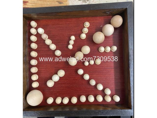 Set within a deep, dark-stained wooden frame, the work features a collection of light-colored, natural wood spheres arranged on a rich reddish-brown surface. The composition is grounded by two rigid, perpendicular lines of small spheres along the left and bottom edges, suggesting a stable, structured environment or a "closed system."