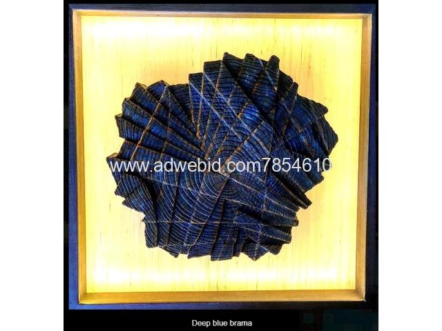 The 3D sculpture "Deep Blue Drama" from ArtPetrovnik.com is a captivating piece of art. It features a complex, geometric form with deep blue hues and intricate patterns. The sculpture appears to be made of a material that has been folded or layered to create a dynamic, textured surface. It is displayed in a wooden frame with a light background that highlights its details and depth. The interplay of light and shadow on the sculpture's surface adds to its visual interest, making it a striking piece of art.
